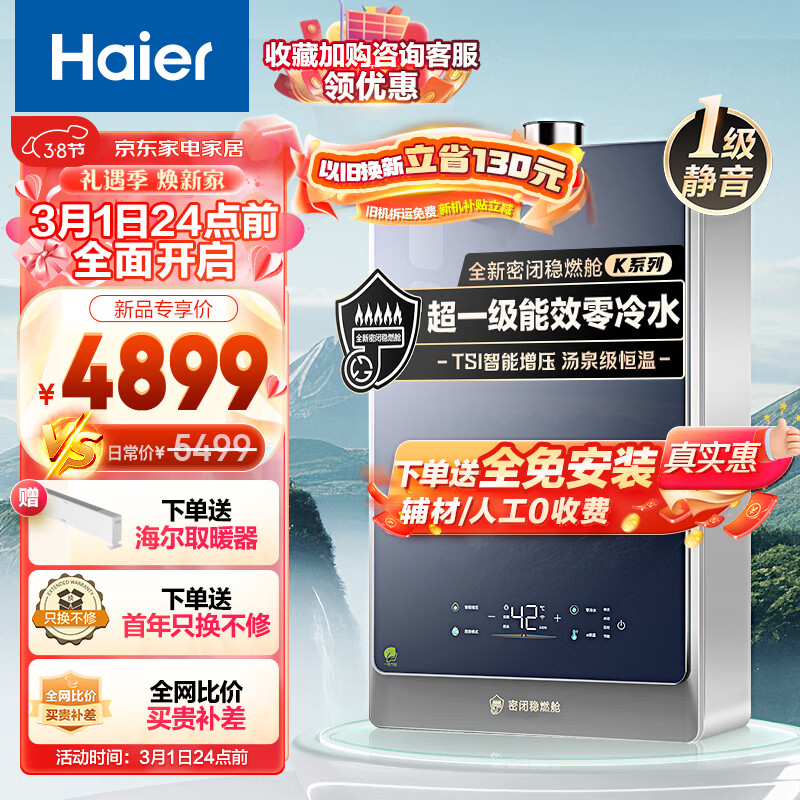 海尔(Haier)16升燃气热水器天然气超一级能效 无级变频水伺服 五段微火控温 TSI增压 JSLQ27-16KLN-ECO7FLRGU1价格:5399.00元!