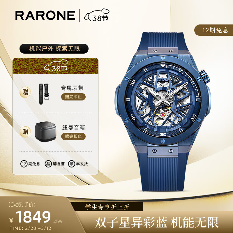 雷诺(RARONE)手表 解构派双子星RebelX男士机械表情人节礼物镂空腕表 异彩蓝价格:2129.00元!