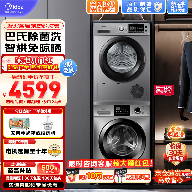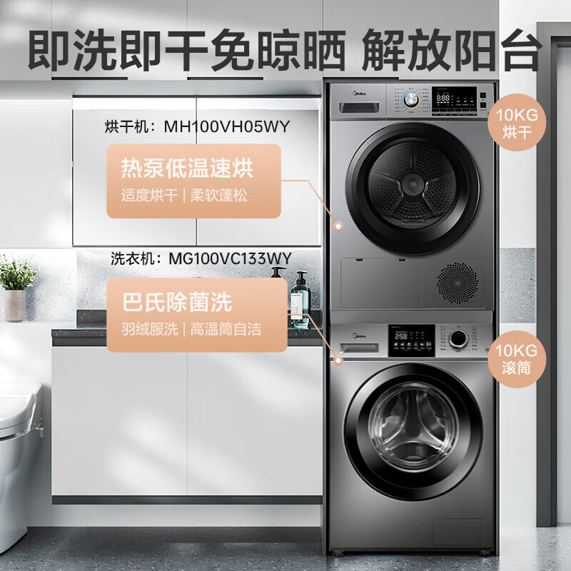 美的(Midea)洗烘套装 10公斤变频滚筒洗衣机+10公斤热泵式除菌干衣机 巴氏除菌 以旧换新 VC133+MH100VH05WY价格:4599.00元!