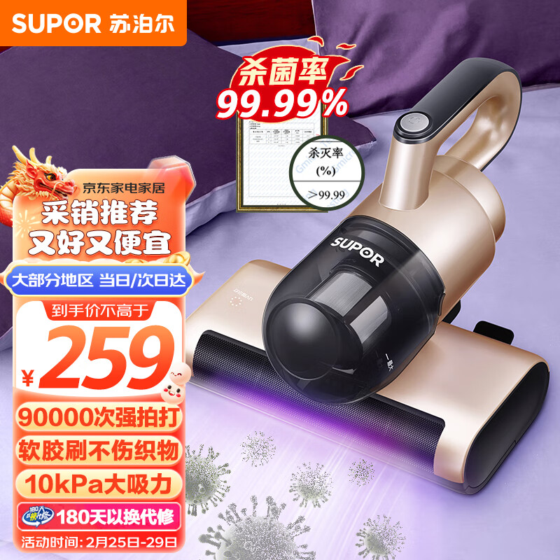 苏泊尔 (SUPOR )除螨仪手持床铺家用吸尘 滚刷拍打紫外线杀菌VCM12T价格:269.00元!