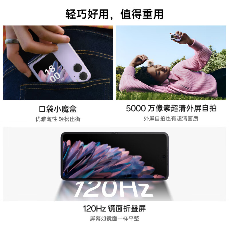 OPPO Find N2 Flip 12GB+256GB 流金 任意窗 5000万超清自拍 120Hz镜面屏 4300mAh大电量 5G 小折叠屏手机价格:4999.00元!