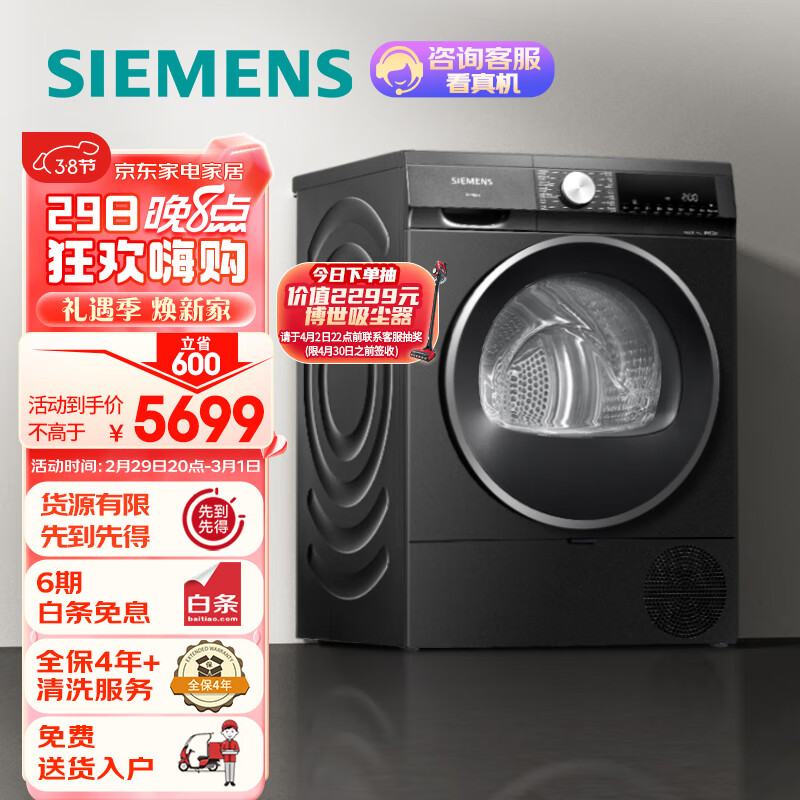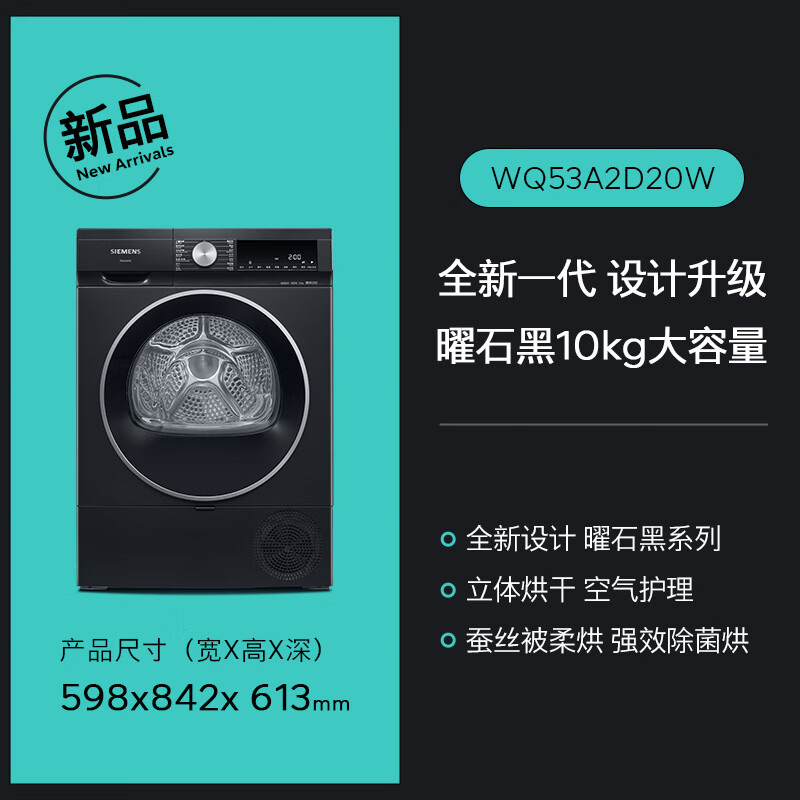 西门子(SIEMENS)iQ300 曜石黑系列10公斤家用热泵干衣机 除菌除螨 羽绒服烘 多维立体烘干 D20W价格:6299.00元!