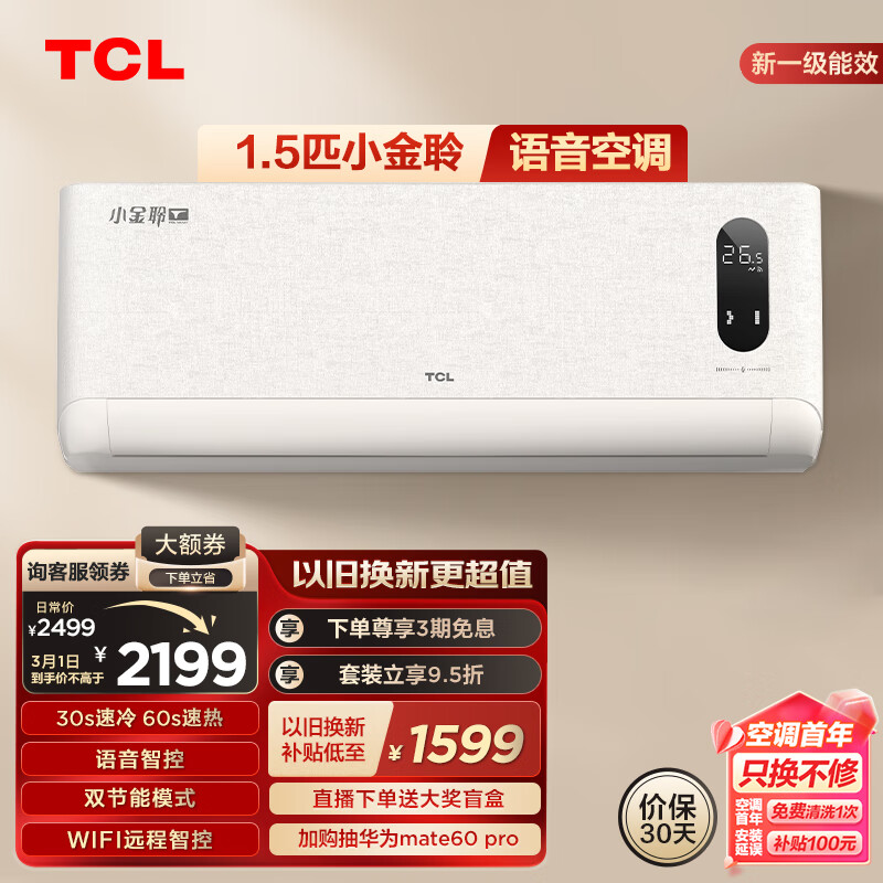 TCL空调1.5匹新一级能效变频冷暖 小金聆T7G 智慧语音 卧室壁挂式空调挂机KFR-35GW/RT7Ga+B1以旧换新价格:2199.00元!