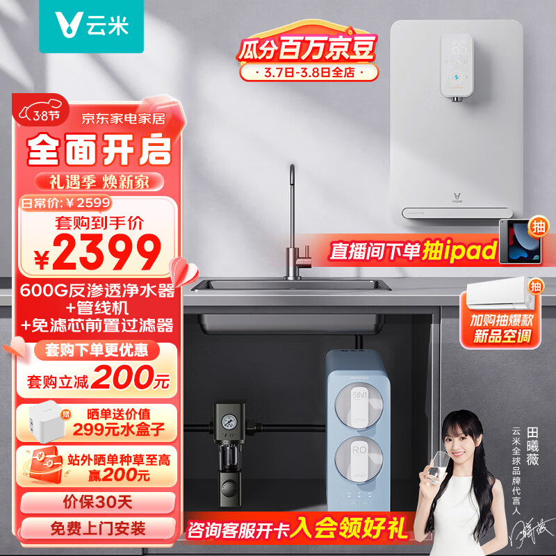 云米(VIOMI)小蓝调600G全屋净水套装净水器+管线机MG2-B+前置过滤器VF4-A三件套家用直饮加热即热净水器净水机价格:2599.00元!