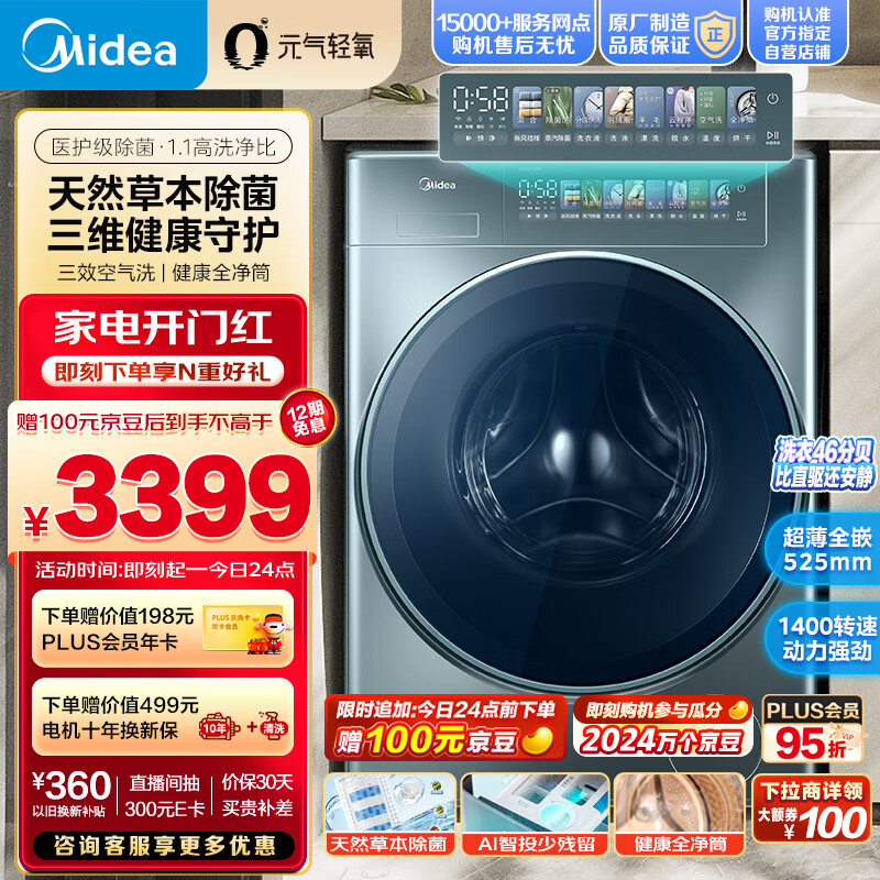 美的(Midea)滚筒洗衣机全自动 AIR3 元气轻氧系列 MD100LAIR 洗烘一体机 天然草本除菌 超薄全嵌 1.1洗净比价格:3499.00元!