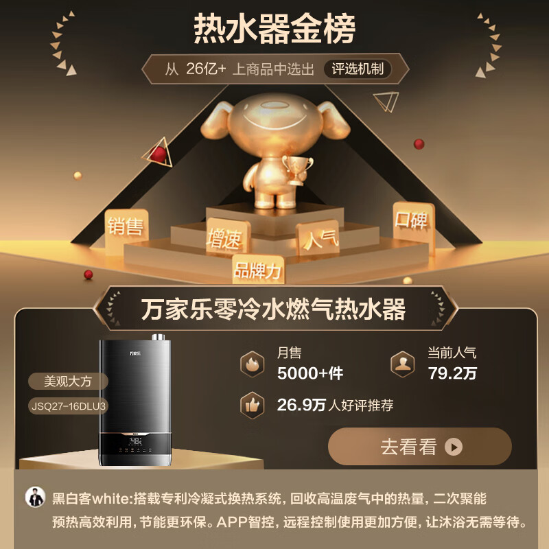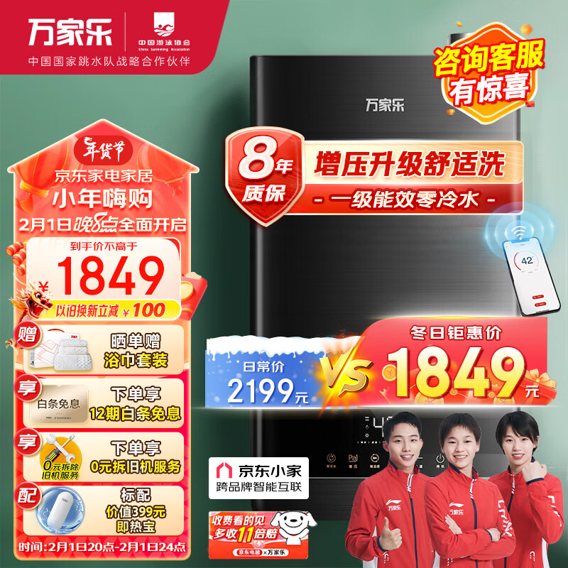 万家乐16升燃气热水器零冷水一级能效冷凝式天然气佛山标准增压京东小家智控JSLQ27-16DLU3【金榜爆品】价格:1899.00元!