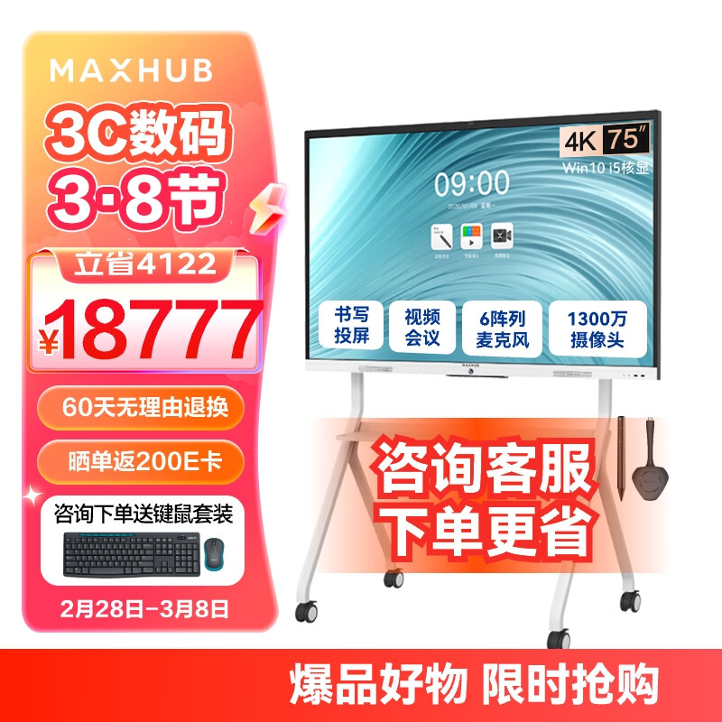 maxhub视频会议平板一体机直播展示触控书写投屏内置摄像头麦克风新锐Pro75 Win10+时尚支架+传屏+笔价格:18777.00元!
