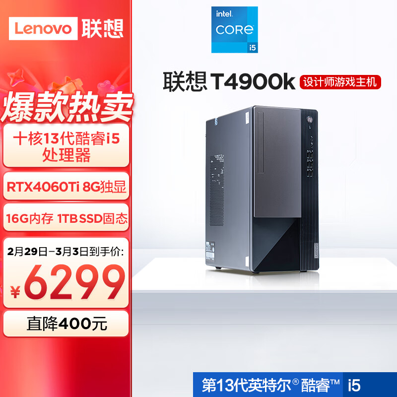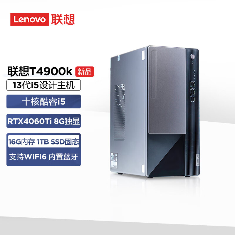 联想(Lenovo)T4900k 设计师游戏商用台式电脑主机(13代酷睿i5-13400F RTX4060Ti 8G 16G 1TB SSD)价格:6299.00元!