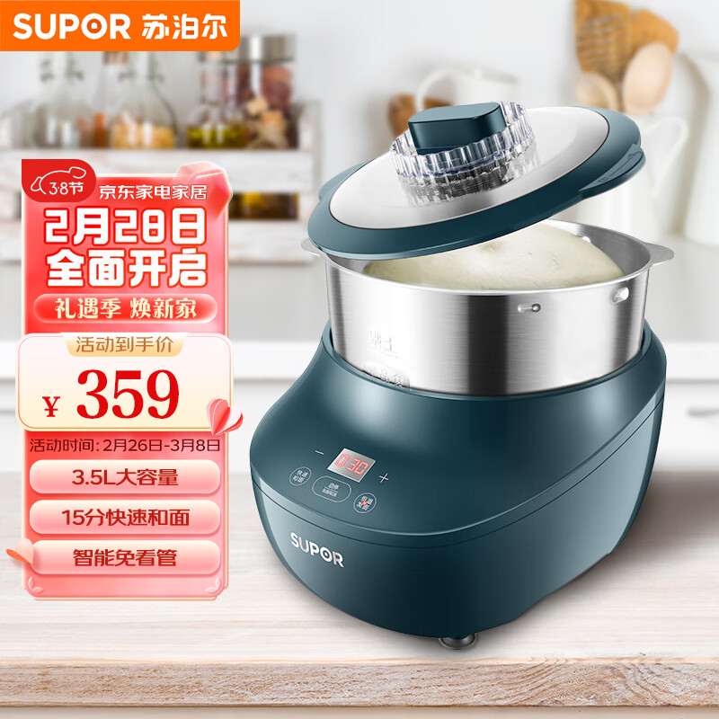 苏泊尔 (SUPOR)厨师机家用和面机 3.5L低噪全自动揉面机 多功能搅面机一键发酵醒面复古绿 SHM02价格:409.00元!