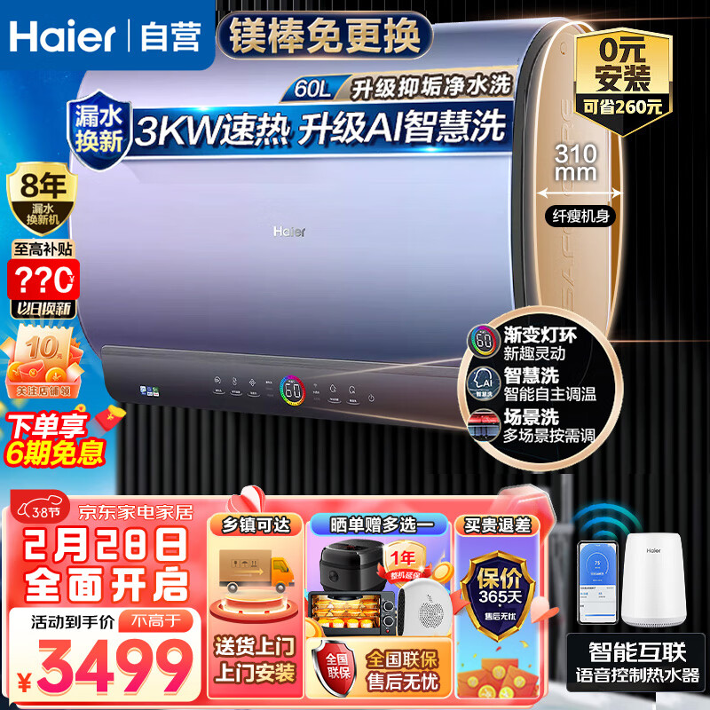 海尔(Haier)电热水器60升扁桶热水器双胆速热WIFI智能物联一级能效内胆免清洗镁棒免更换健康净水洗浴RC5价格:3499.00元!