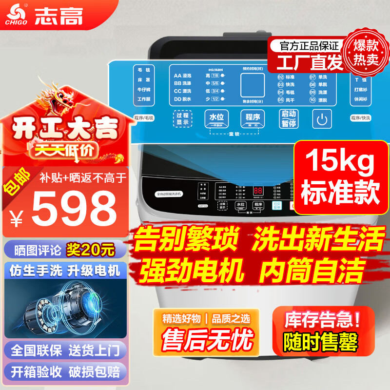 志高(CHIGO)洗衣机15公斤大容量家用商用全自动波轮洗衣机智能洗脱一体机 蓝光洗护强劲电机仿生手洗 灰色价格:648.00元!