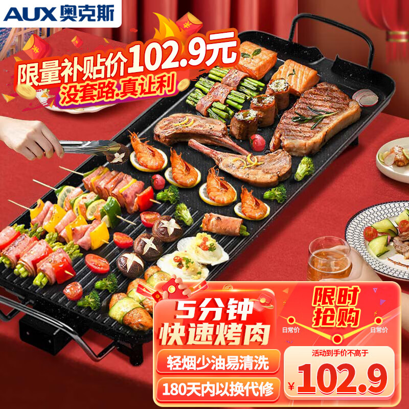 奥克斯(AUX)电烧烤炉 家用电烤盘不沾烤肉烧烤锅烤串机烤肉机电烤锅韩式煎肉锅电烤炉大号 LA-KP-A22JD价格:102.90元!
