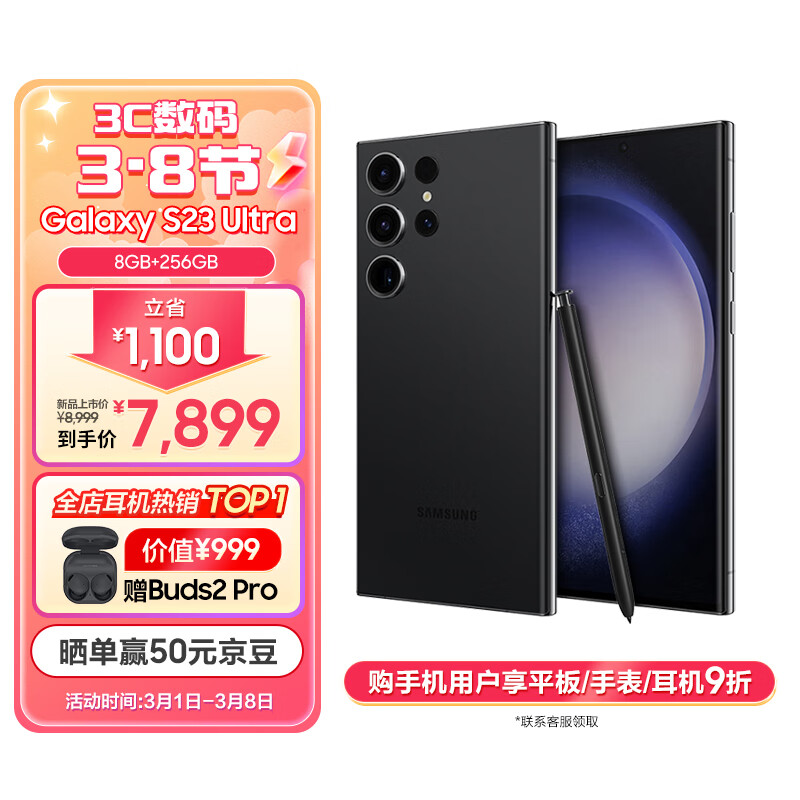 三星 SAMSUNG Galaxy S23 Ultra 超视觉夜拍 稳劲性能 大屏S Pen书写 8GB+256GB 悠远黑 5G手机价格:7899.00元!