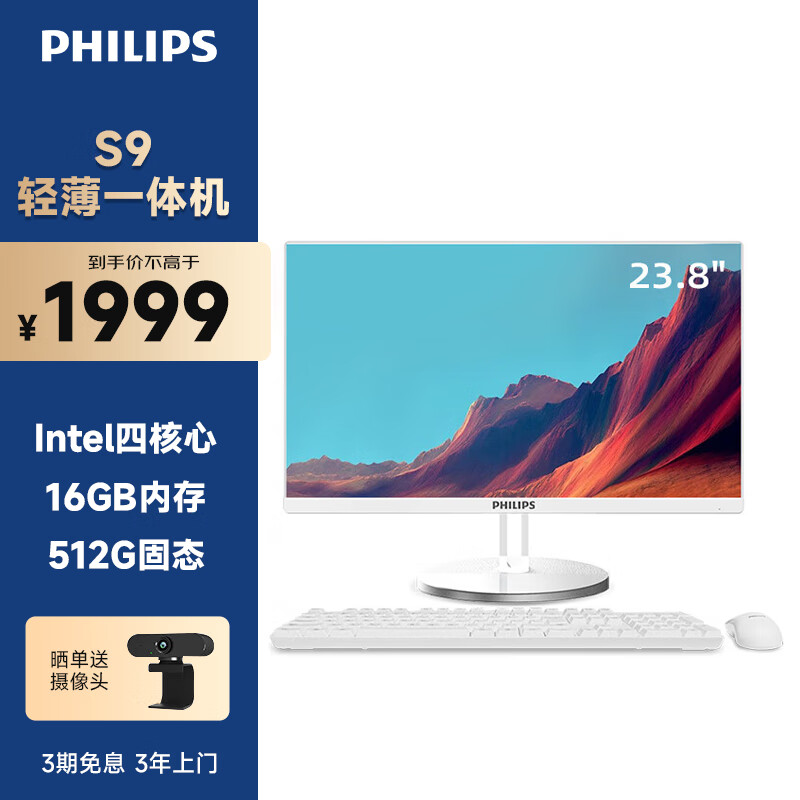 飞利浦S9 23.8英寸台式一体机电脑 商用家用办公学习收银主机(11代4核N5095 16G 512GSSD 双频WiFi)白色价格:1999.00元!