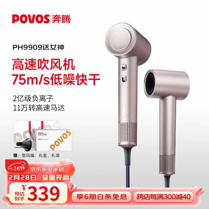 奔腾(POVOS)吹风机家用电吹风筒新一代大功率高速吹风机负离子大风力速干低噪音 PH9909金礼盒装女神节礼物价格:619.00元!