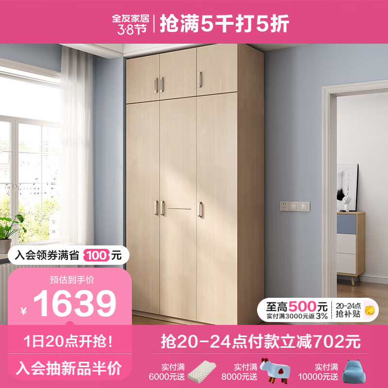 全友家居 衣柜自然原木风木纹衣柜多规格组合卧室储物柜子106302价格:2341.43元!