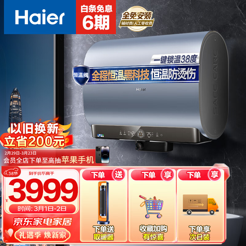 海尔(Haier)60升家用全隐藏式安装电热水器3000W速热 新一级能效 全管路恒温 镁棒免更换 EC6003-WARM7U1价格:4399.00元!