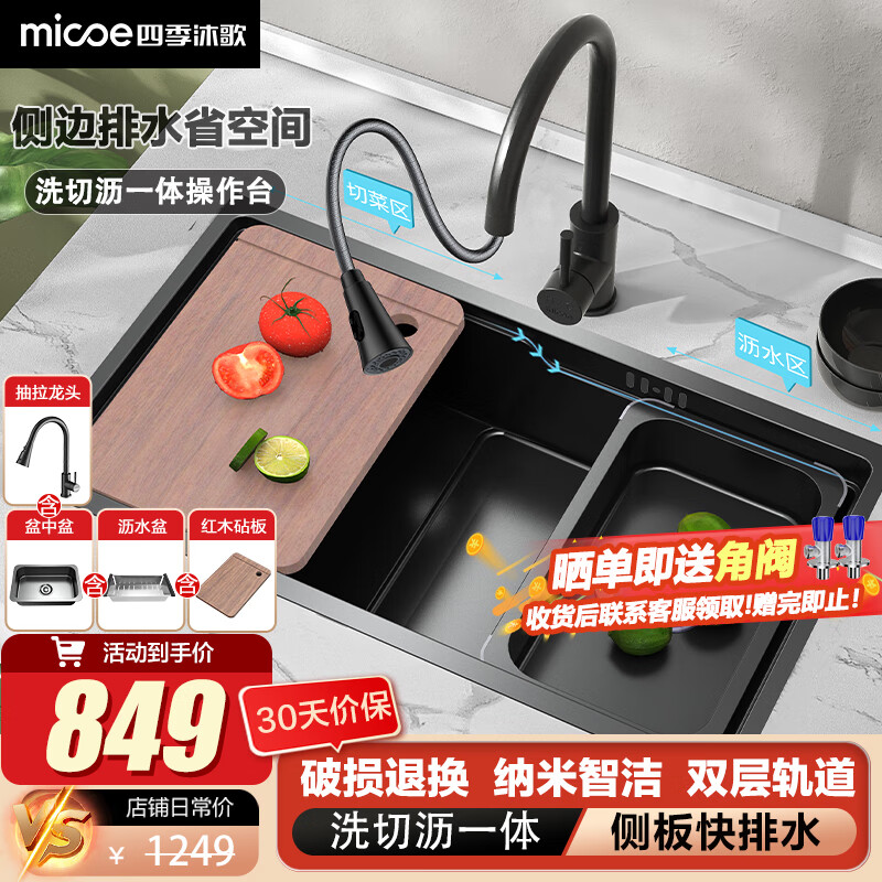 四季沐歌(MICOE)厨房水槽单槽纳米304不锈钢洗菜盆台下盆多功能阶梯式龙头大容量价格:1249.00元!