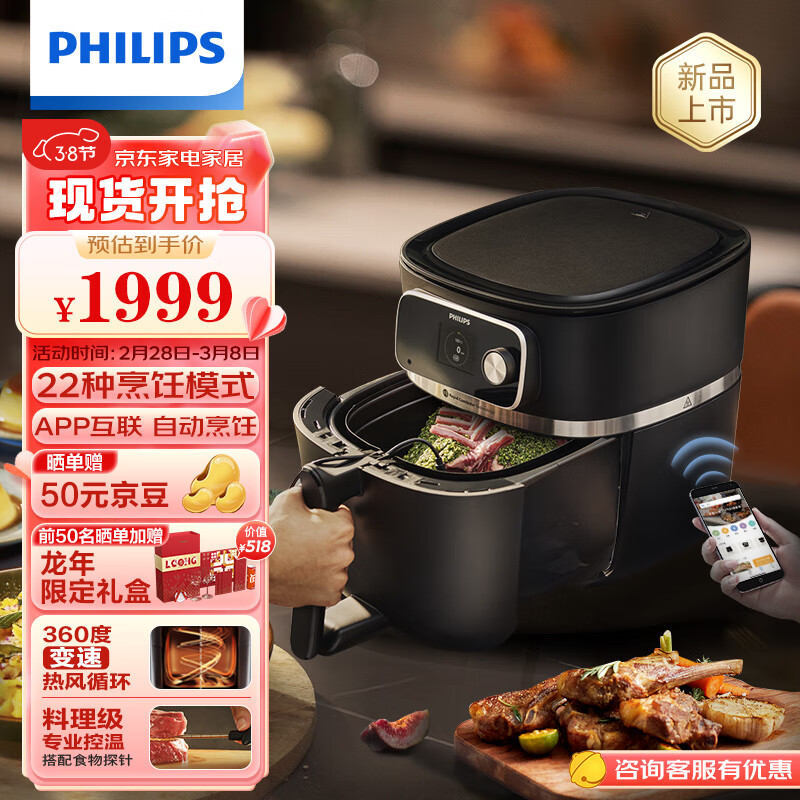 飞利浦(PHILIPS)全新变速空气炸锅8.3L大容量智能烹饪精准控温不用翻面APP智能菜谱多功能烤箱百变空气锅HD9880价格:1999.00元!