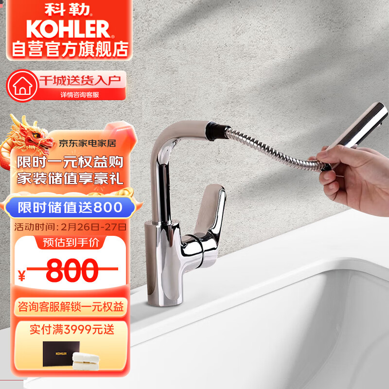 科勒(KOHLER)浴室龙头利欧洗脸洗头台盆冷热水龙头 抽拉式性价比款20710价格:999.00元!