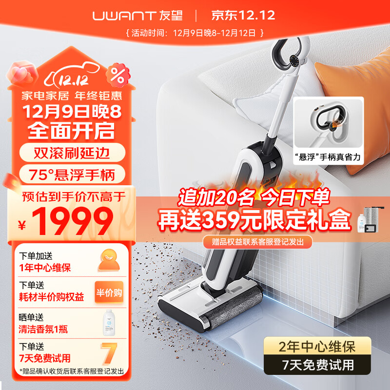 uwant友望小白洗地机家用 吸洗拖一体机拖地机擦地机吸尘 双滚刷洗地机热风烘干X100MAX价格:1999.00元!
