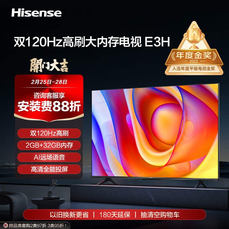海信电视75E3H 75英寸 120Hz 2+32GB 远场语音 MEMC防抖大屏 智慧屏 智能液晶平板电视机 以旧换新价格:2999.00元!