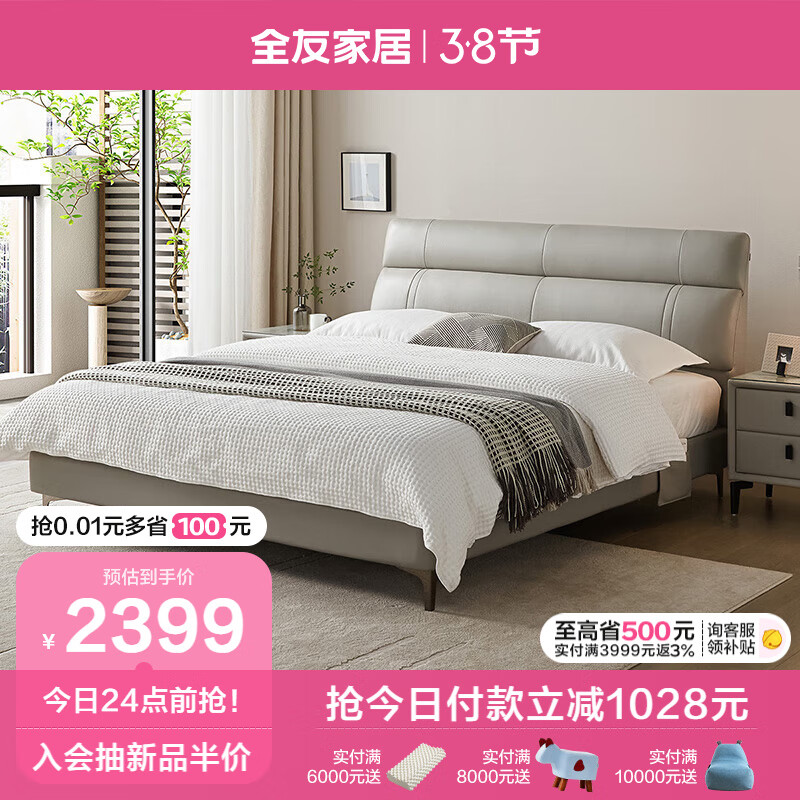 全友家居 真皮床意式极简高脚加厚腰靠双人大床2米主卧软床家具105251价格:3427.14元!