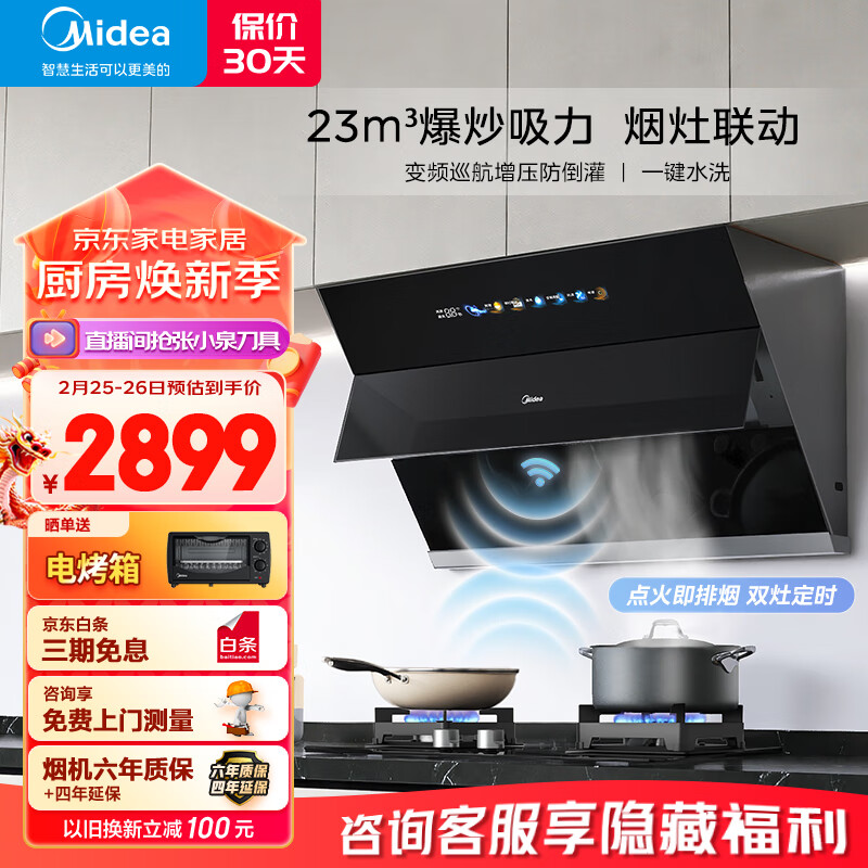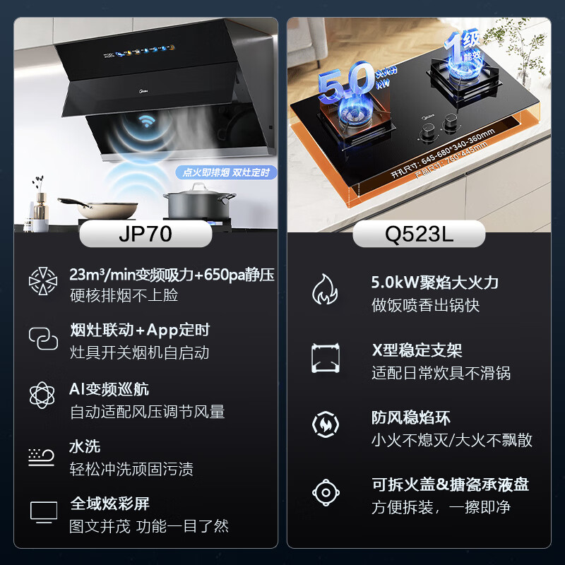 美的(Midea)抽油烟机燃气灶家用侧吸23风量超真实屏 挥手智控自清洗 变频烟灶联动套装JP70+Q523L天然气价格:2899.00元!