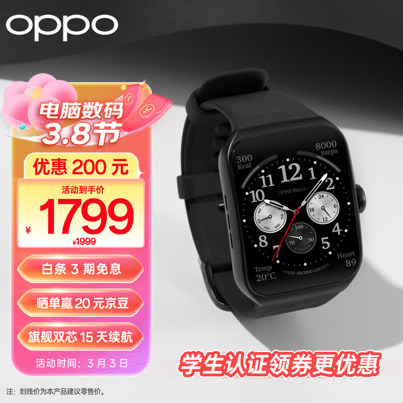 OPPO Watch 3 Pro 铂黑 全智能手表 健康运动手表男女eSIM电话手表 血氧心率监测 适用iOS安卓鸿蒙手机价格:1799.00元!