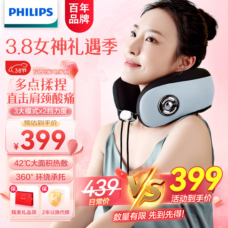 飞利浦(PHILIPS)颈椎按摩器 肩颈按摩仪物理揉捏热敷按摩枕支撑颈托 三八妇女节礼物送妈妈女友 3104N价格:439.00元!