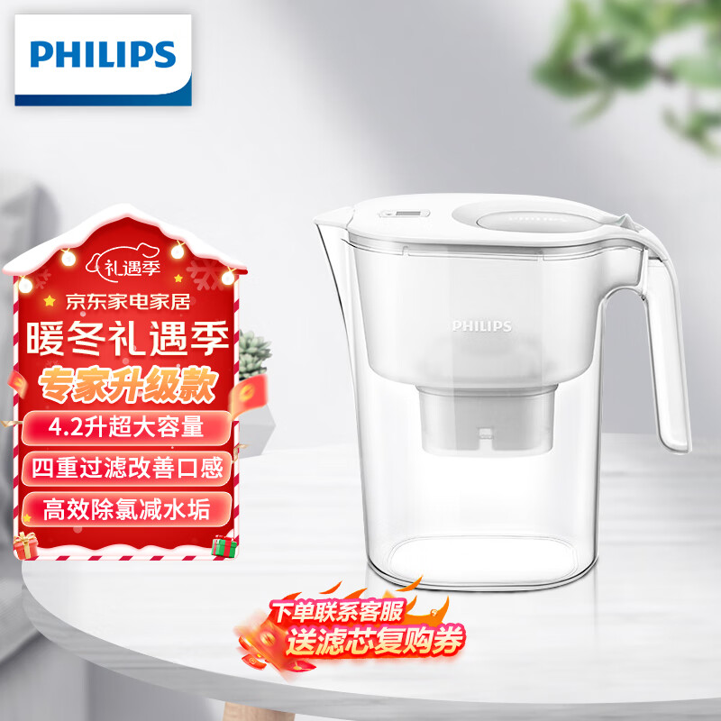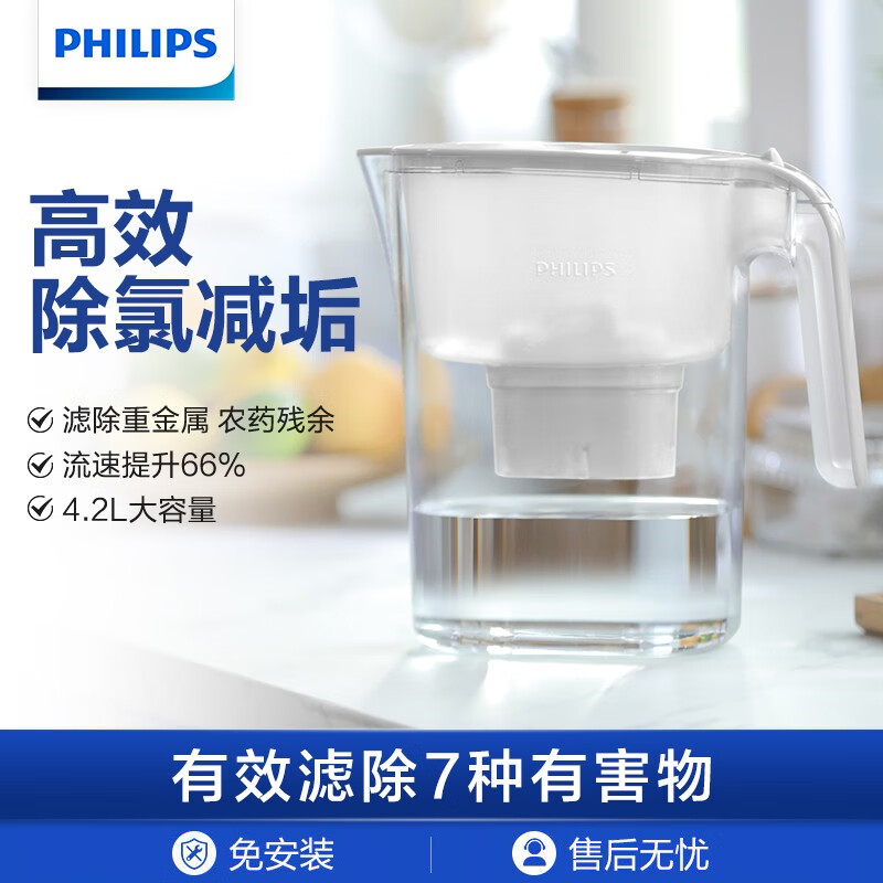 飞利浦(PHILIPS)全新升级净水壶 家用滤水壶 厨房自来水过滤净水器 AWP2814WHT价格:89.00元!
