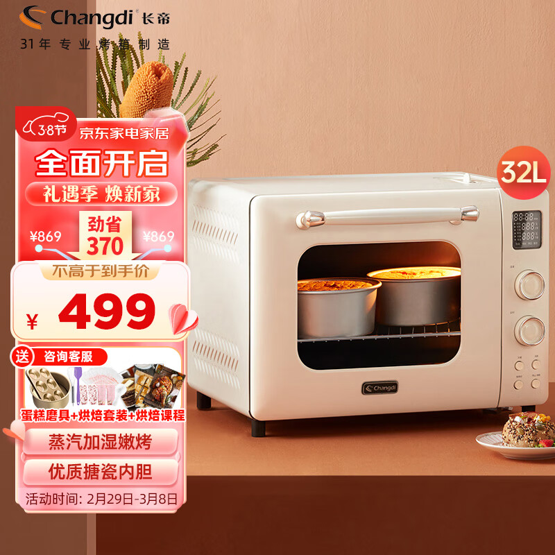 长帝(changdi)家用多功能电烤箱 创新加湿嫩烤 32升大容量 3D弧形聚能门 LCD显示屏 小馋猫价格:499.00元!