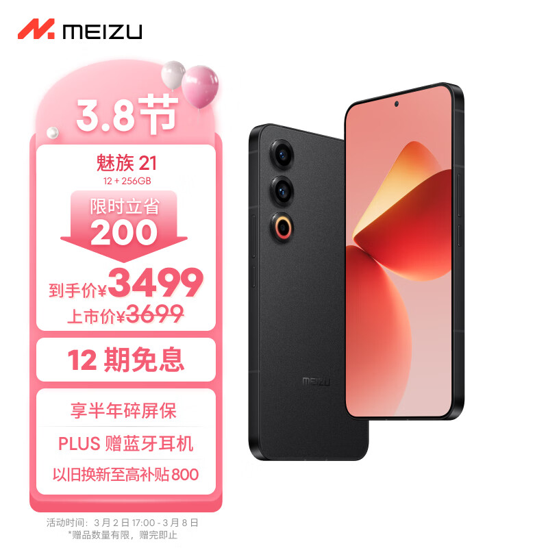 魅族(MEIZU)21 12GB+256GB 无界黑 1.74mm极窄四等边直屏 骁龙8Gen3 2亿像素 80W超充 5G游戏学生拍照手机价格:3499.00元!