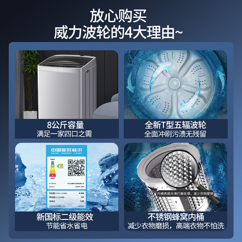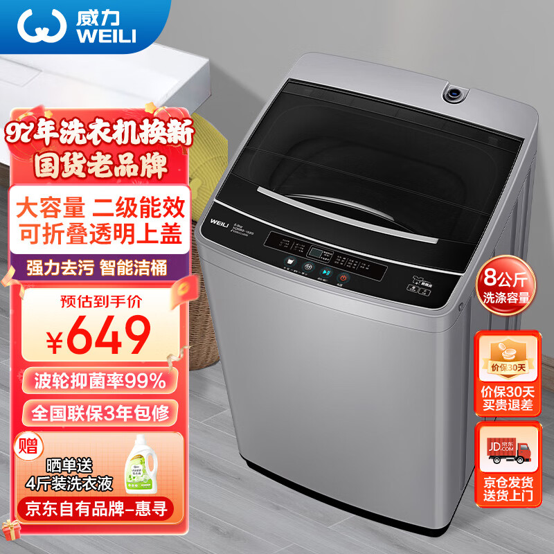 威力(WEILI)8公斤 波轮洗衣机全自动大容量 13分钟快洗 10档水位 护衣内筒防锈箱体 以旧换新XQB80-1999价格:649.00元!