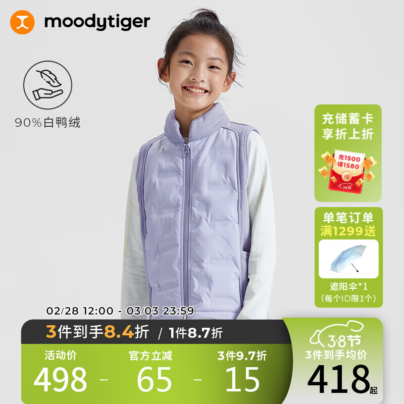moodytiger儿童羽绒马甲23年秋冬季轻薄款男女童中性外穿羽绒背心价格:498.00元!