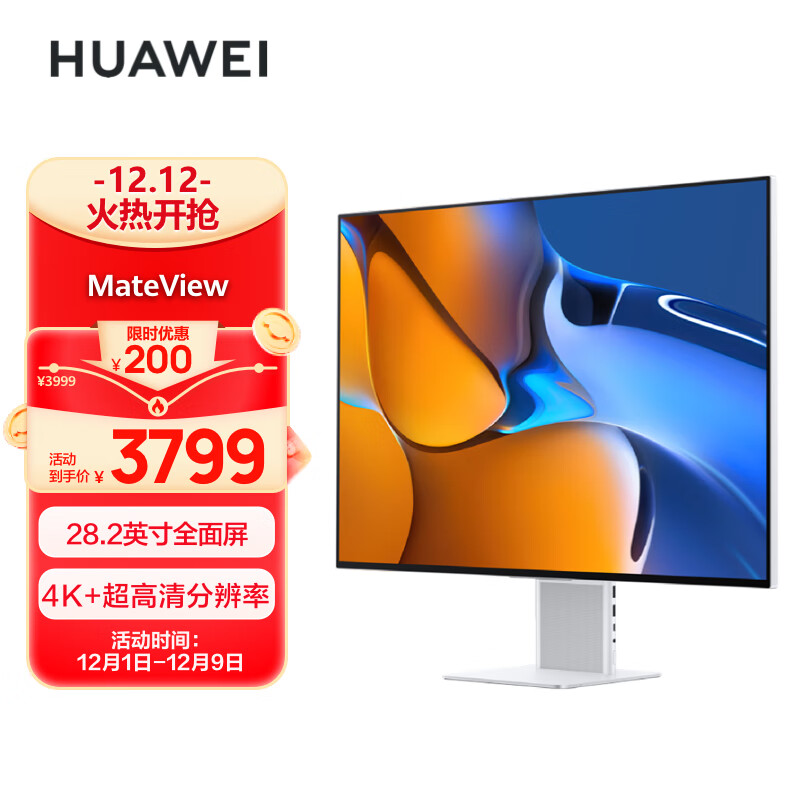 华为HUAWEI MateView显示器28.2英寸 4K+ IPS 98% P3色域 HDR400 TypeC 65W无线投屏 内置音箱 电脑办公价格:3799.00元!