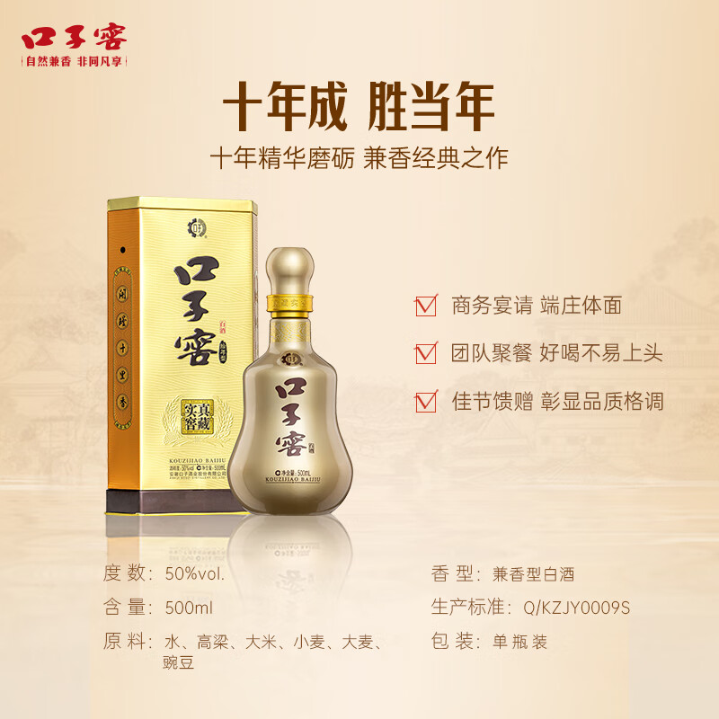 口子窖十年型兼香型白酒50度500ml*1瓶 纯粮口子酒 送礼宴请价格:385.00元!