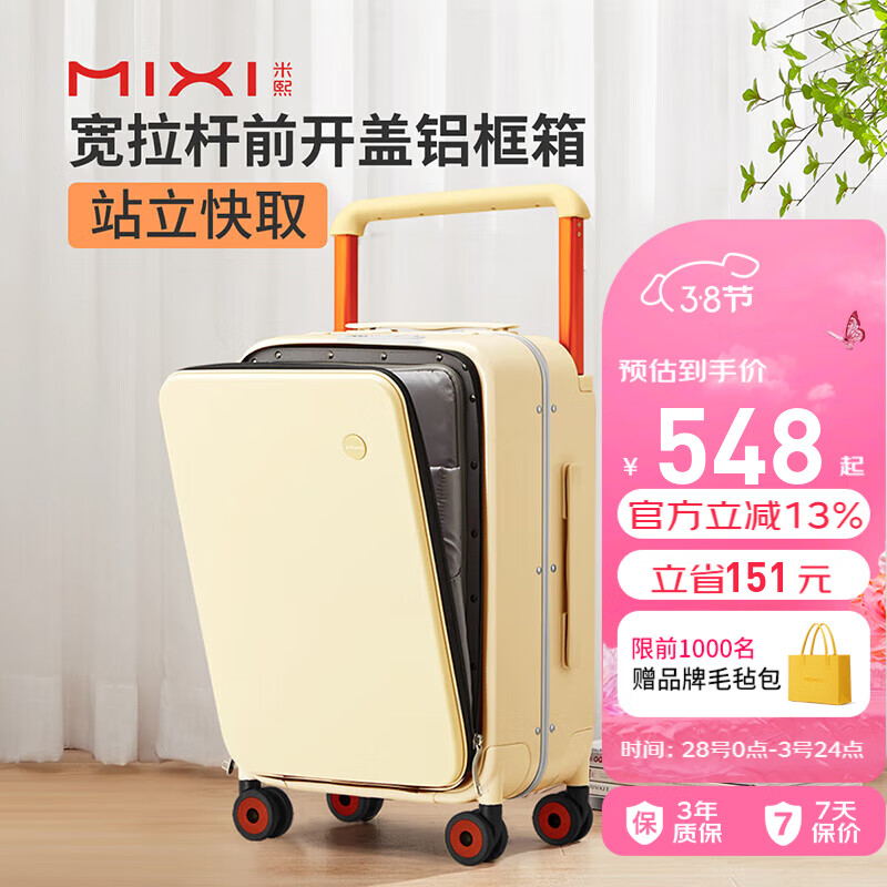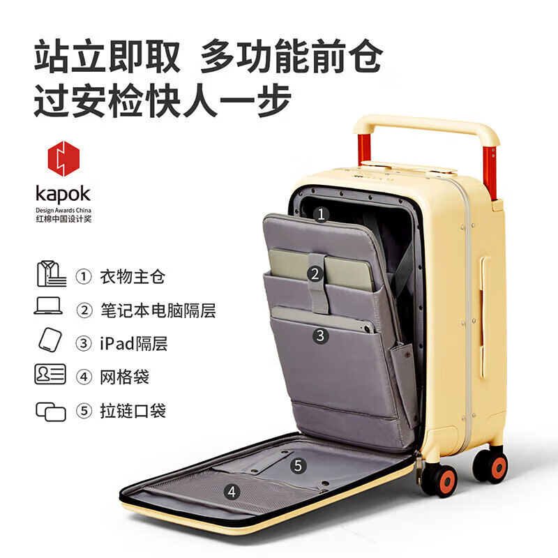 米熙前开盖铝框拉杆箱子行李箱飞机密码箱女旅行箱包男20英寸云雀黄75价格:699.00元!