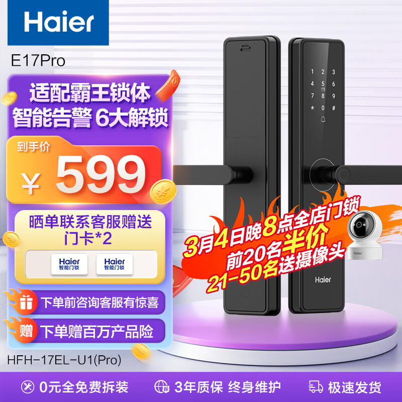 海尔 (Haier) 智能门锁 指纹锁 密码锁 家用防盗门智能联网 防盗门 入户门 木门 电子锁 E17PRO霸王锁体-下单前请联系客服确认价格:699.00元!