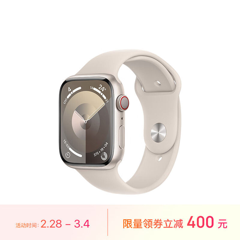 Apple/苹果 Watch Series 9 智能手表GPS+蜂窝款45毫米星光色铝金属表壳星光色运动型表带S/M MRP13CH/A价格:3999.00元!