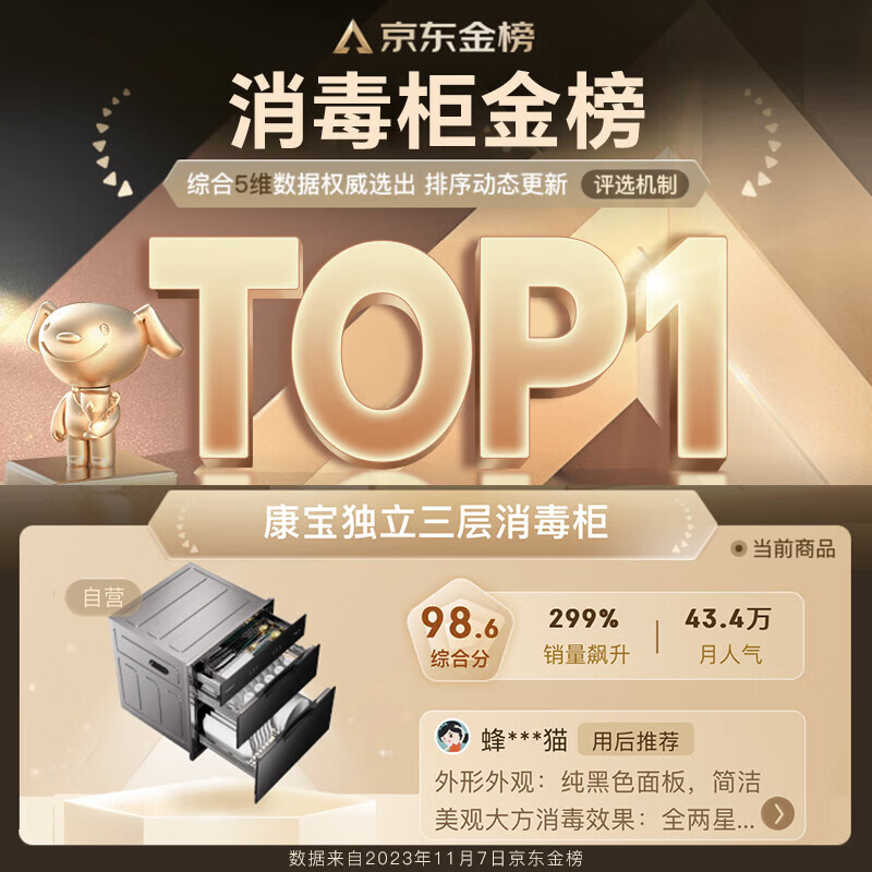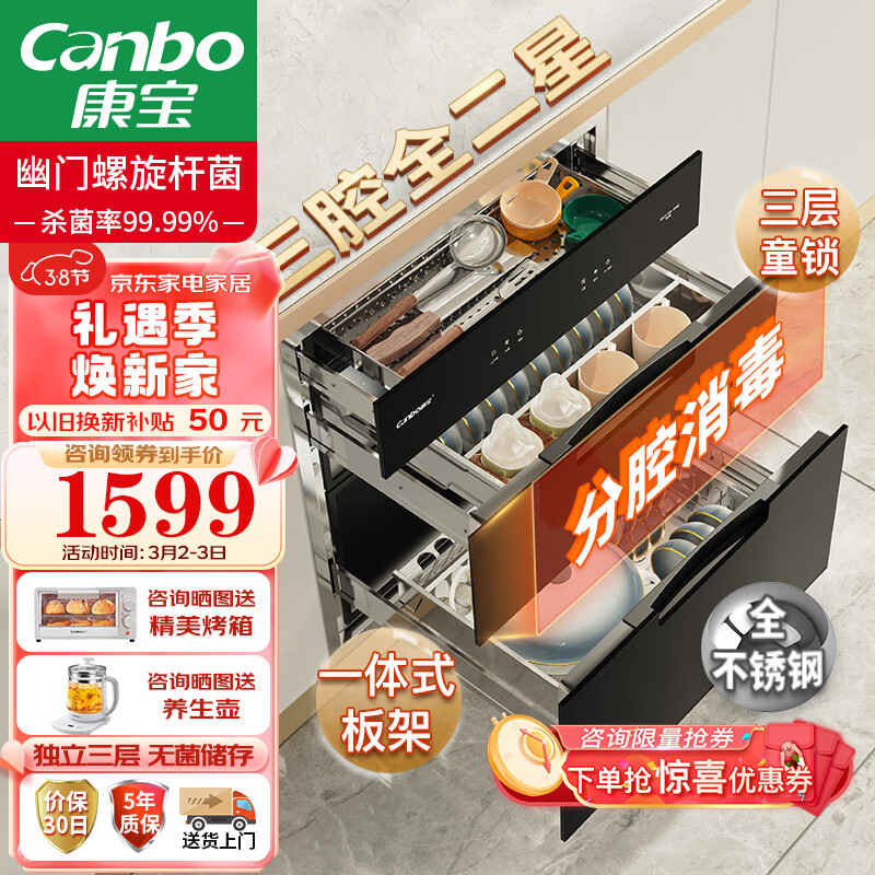 康宝(Canbo)三门三层不锈钢 磐石 消毒柜 嵌入式 家用 大容量紫外线高温二星厨房碗筷餐具消毒碗柜 XDZ100-ONE价格:1799.00元!