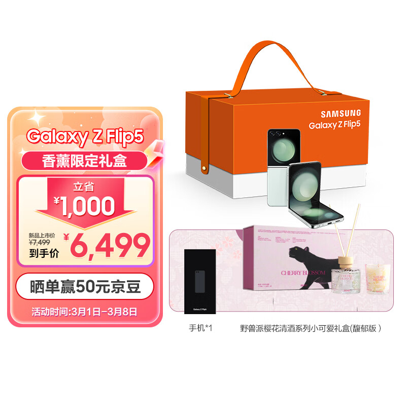 三星 SAMSUNG Galaxy Z Flip5 5G折叠手机 香薰限定礼盒 8GB+256GB 冰薄荷价格:6499.00元!