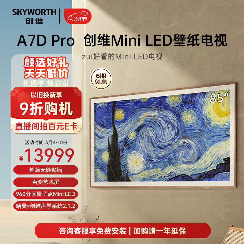 创维壁纸电视85A7D Pro 85英寸龙年定制超薄壁画艺术电视机 无缝贴墙 960分区量子点Mini LED巨幕大屏价格:13999.00元!