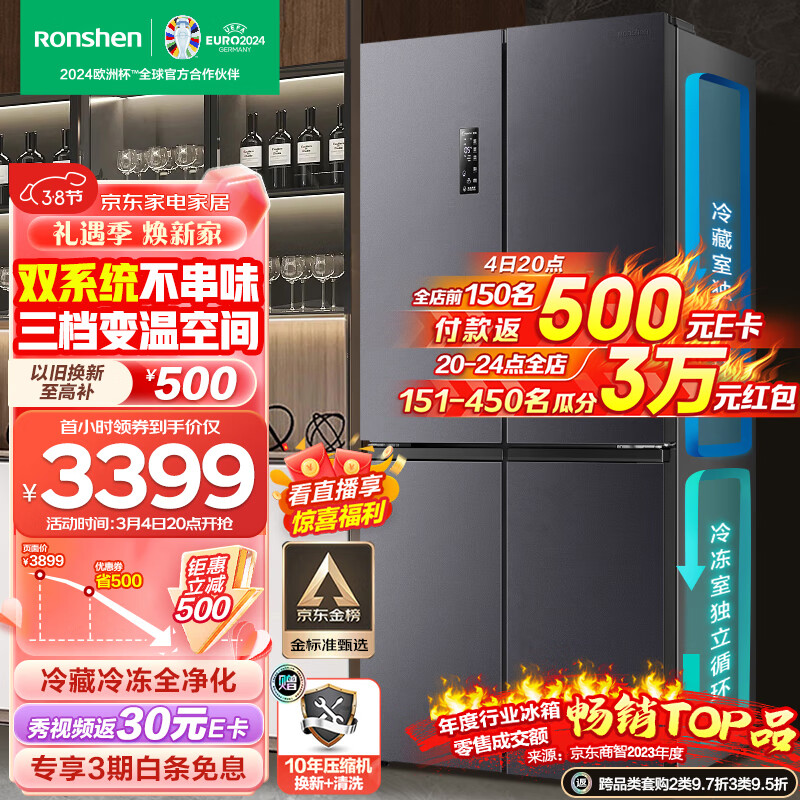容声(Ronshen)【501升级款】离子净味Pro版 513升四开门十字对开门嵌入式冰箱家用一级变频BCD-513WD12FPA双循环价格:3899.00元!