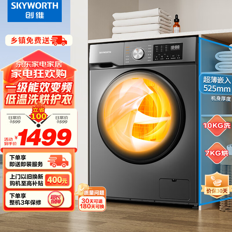 创维(SKYWORTH)滚筒洗衣机 全自动 洗烘一体机10公斤大容量 超薄嵌入 空气洗 除菌除螨 XQG100-B26RBH价格:1499.00元!
