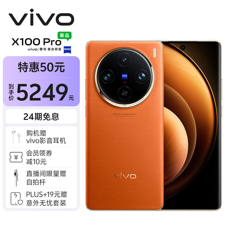 vivo X100 Pro 16GB+256GB 落日橙 蔡司APO超级长焦 蓝晶×天玑9300 5400mAh蓝海电池 自研芯片V3 手机价格:5299.00元!