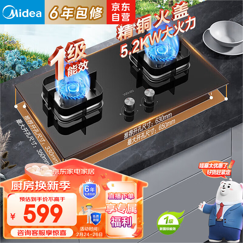 美的(Midea)出品燃气灶天然气灶双灶猛火灶炉灶 铜火盖一级能效 5.2kW大火力灶台灶具 天然气灶 WAHIN JZT-HQ8价格:599.00元!