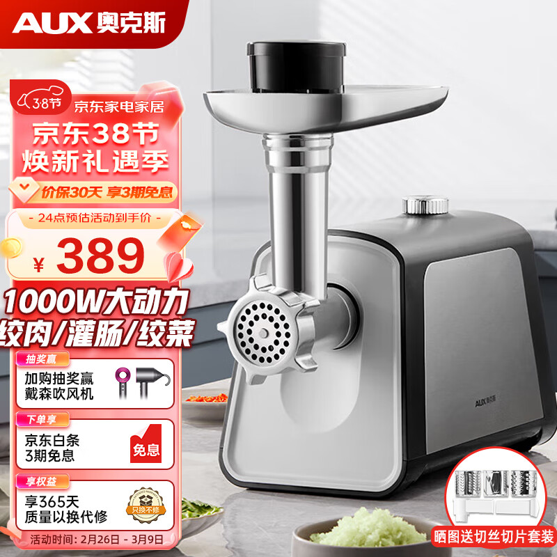 奥克斯(AUX) 绞肉机家用 灌肠机商用1000W大功率多功能电动不锈钢绞馅搅拌机碎肉碎蒜菜打肉馅机 HX-J358 不锈钢色价格:489.00元!