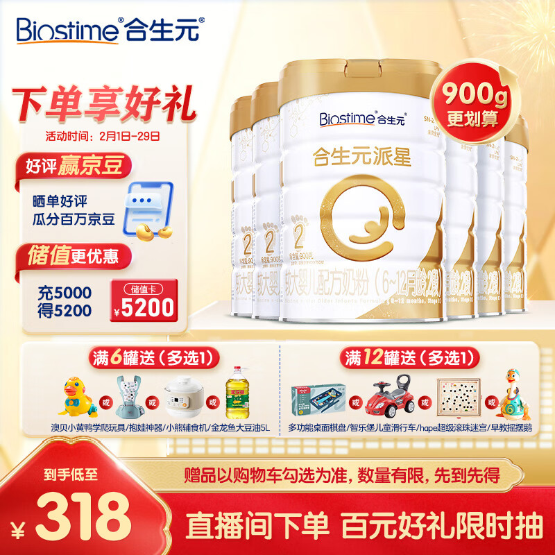 合生元(BIOSTIME)派星较大婴儿配方奶粉2段(6-12个月) 法国进口900克*6罐价格:2118.00元!