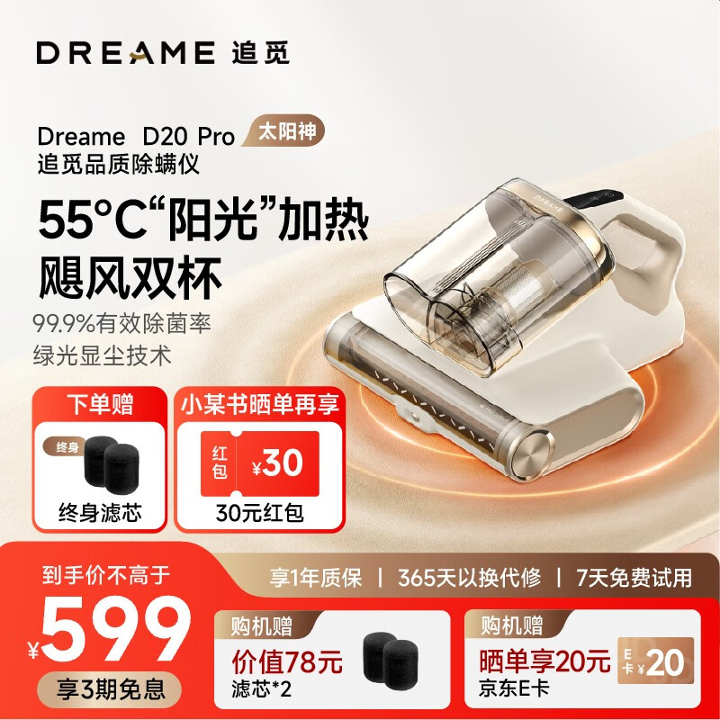 追觅【3.8女神节】D20Pro 55℃阳光加热板 绿光显尘双尘杯 家用床上吸尘器大吸力紫外线杀菌除湿除螨仪价格:599.00元!